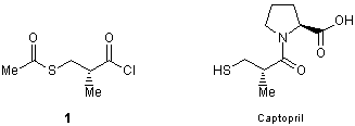 (R)-3-(Acetylthio)isobutyryl Chloride (1) was introduced into prolines followed by deacetylation to give Captopril. Captopril is an effective inhibitor of the angiotensin converting enzyme (ACE), which is utilized in the treatments of hypertension. Recently, there have been many other studies where 1 has been introduced into amino acids and nitrogen-containing heterocycles to make new products with improved medicinal effects.