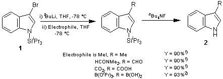 本品1にアルキルリチウム試薬を作用させ3-リチオ体とした後,種々の求電子試薬を反応させることにより,3-置換インドールが収率良く得られます。これはかさ高い保護基を有する1を用いることにより,リチウム転位による2-置換インドールの生成や環開裂反応を抑えることができるためです1)。